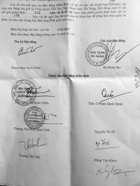 Theo biên bản của Hội đồng khoa học lập ngày 14 tháng sáu năm 2013, ngoài thành viên của Hội đồng thẩm định Cổ vật thành phố gồm 06 vị, Hội đồng thẩm định còn mời các chuyên gia : Tiến sỹ Nguyễn Đình Chiến chuyên gia giám định cổ vật Quốc gia, Phó giám đốc Bảo tàng lịch sử Việt Nam, Tiến sỹ Phạm Quốc Quân chuyên gia giám định Cổ vật Quốc gia, nguyên giám đốc Bảo tàng lịch sử VN làm thành viên, đã tiến hành giám định bằng nhiều phương pháp và đưa ra đánh giá “đây là bộ sưu tập tượng Phật cổ, phong phú về loại hình, chất liệu, kích thước có giá trị nghệ thuật của nhiều quốc gia, xứng đáng chọn trưng bày, giới thiệu về Di sản văn hóa Phật giáo, Bộ sưu tập có những nhóm tượng bằng chất liệu đồng, gỗ sơn thếp thuộc loại quý hiếm, thể hiện nghệ thuật đúc, tạc tinh xảo. Trong đó Tượng Phật Quán Âm Tống tử và Bát hương sứ hoa lam có ghi năm Thiệu Trị là đồ cổ liên quan Cung đình Huế. Bộ sưu tập có thể trưng bày và xuất bản thành tập sách Nghệ thuật Phật giáo.”