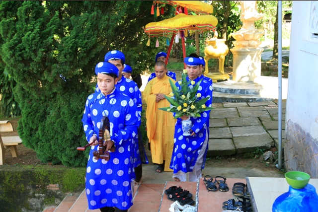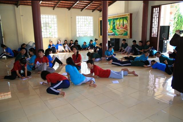 Sau khi hoàn thành bài thi viết cảm niệm và nghỉ giải lao, các khóa sinh tiếp tục được thực hành nghi thức quá đường và niệm Phật kinh hành dưới sự hướng dẫn của chư Tôn thiền đức BTS GHPGVN huyện A Lưới.