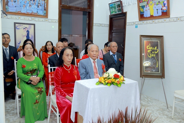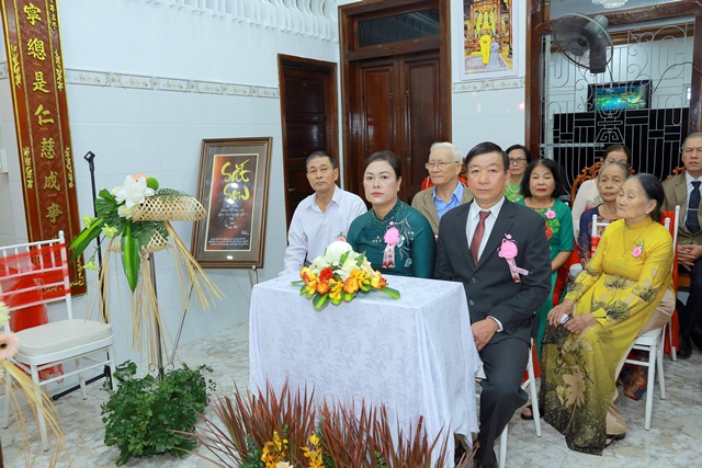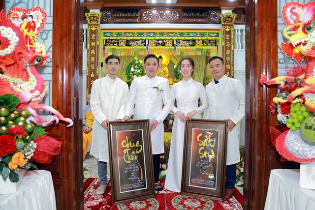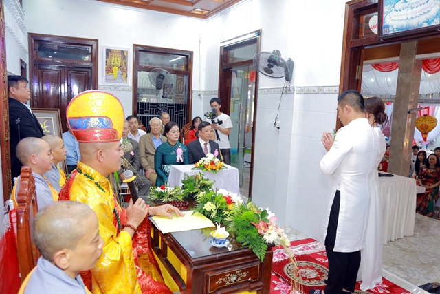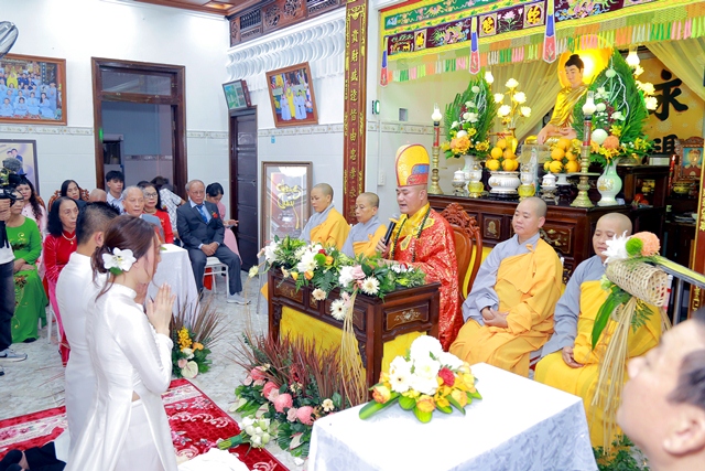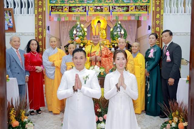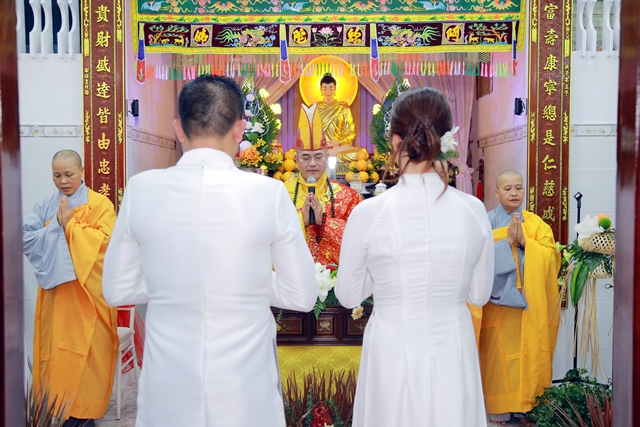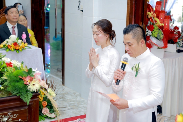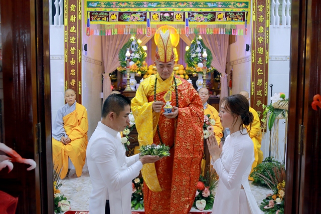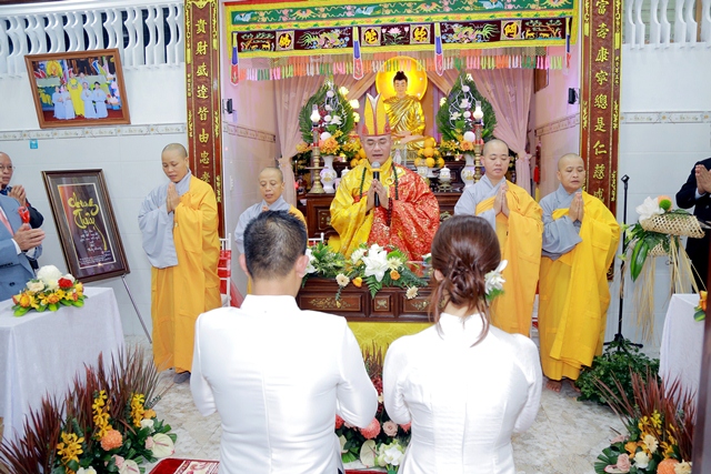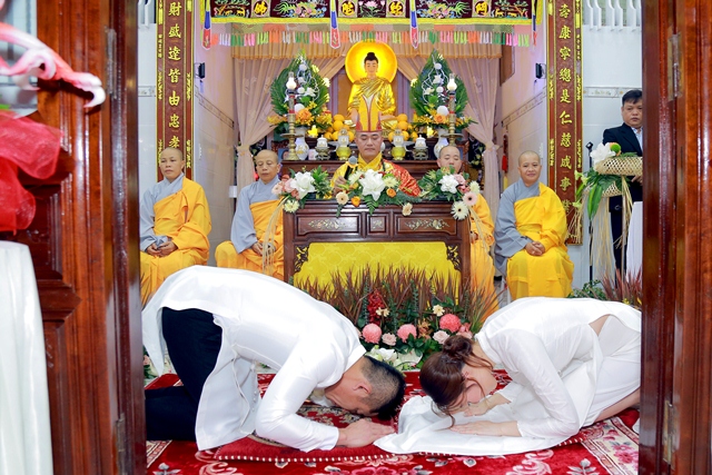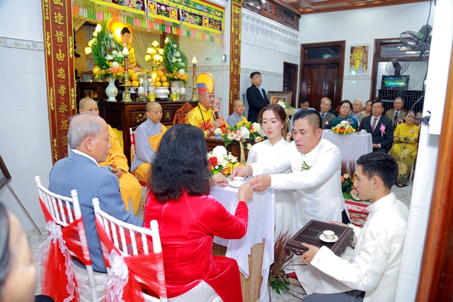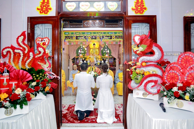 Dưới ánh từ quang của Tam Bảo, đôi tân lang và tân nương đã thành kính thực hiện các nghi thức thiêng liêng, xác lập một cuộc sống hôn nhân thực tế và thiện lành: