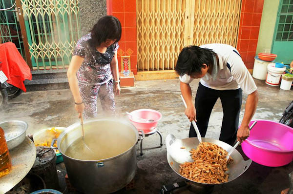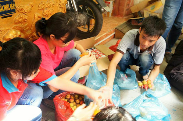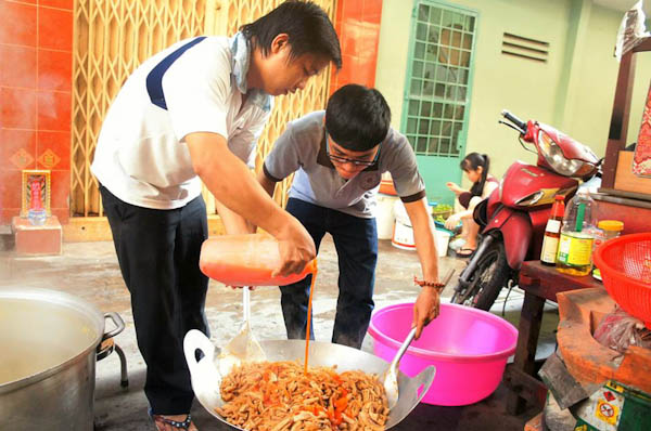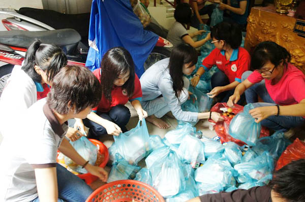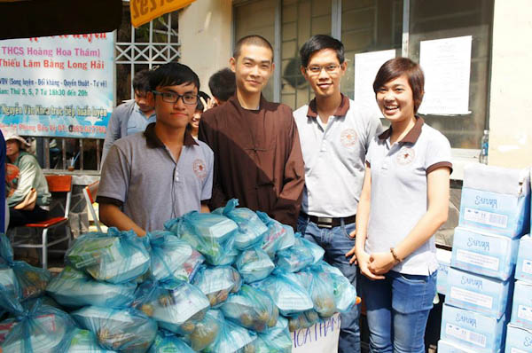Các bạn thành viên Hội đã đến Chùa Thiện Mỹ vào lúc sáng sớm để cùng nấu cơm, cắt gọt rau củ quả … cùng với ban hậu cần xáo nấu thức ăn. Sau đó cho thức ăn vào hộp, các món canh, kho, xào, trái cây, hộp sữa … hoàn tất, đại chúng đã chuyển 250 phần cơm chay này đến trường thi và phát tặng cho các thí sinh vào lúc 10g30 sáng cùng ngày.