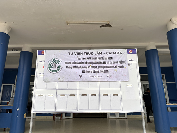 Ngày 11 tháng 11 năm 2025 - Với tấm lòng nhân ái và tinh thần “lá lành đùm lá rách”, Thượng Toạ Thích Pháp Hoà, Trú trì Tu viện Trúc Lâm - Canada đã uỷ cử Đại đức Thích Tâm Phương đại diện để trao tặng 400 phần quà đến bà con vùng lũ tại phường Hoá Châu và phường Phong Dinh, thành phố Huế.
