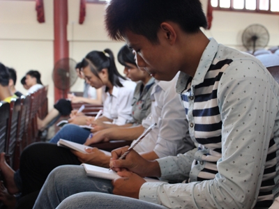 Sáng 26/5, chùa Biện Sơn khai giảng lớp luyện thi đại học miễn phí. Thầy Phạm Bảo, Giáo viên Trường THPT Đồng Đậu (Yên Lạc, Vĩnh Phúc) đến từ rất sớm. Ba năm nay kể từ khi có lớp học tình nguyện này, thầy phụ trách về kế hoạch và chương trình giảng dạy.