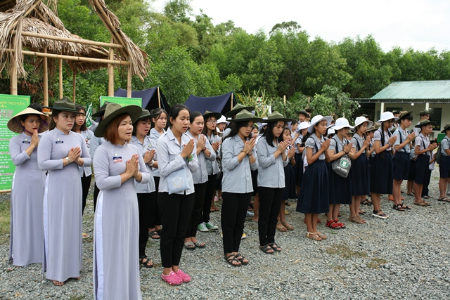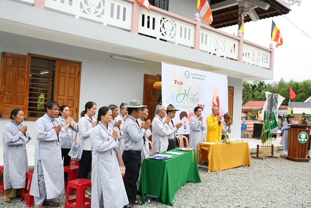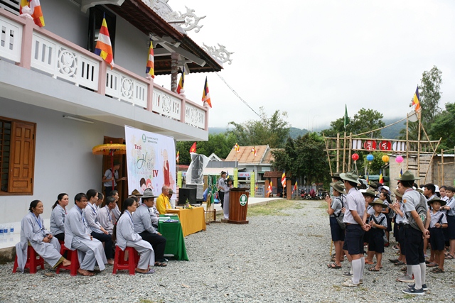 Sau phần niệm Phật cầu gia hộ là cử bài ca Sen Trắng toàn thể gần 30 Đoàn sinh ngành Đồng trang nghiêm trong nghi thức GĐPT; Huynh trưởng: Quảng Trí - Bùi Phước Hồng Sơn, Trại trưởng trại Hiếu ngành Đồng GĐPT Sơn Nguyên lần thứ IV phát biểu khai mạc Trại Hiếu truyền thống GĐPT.