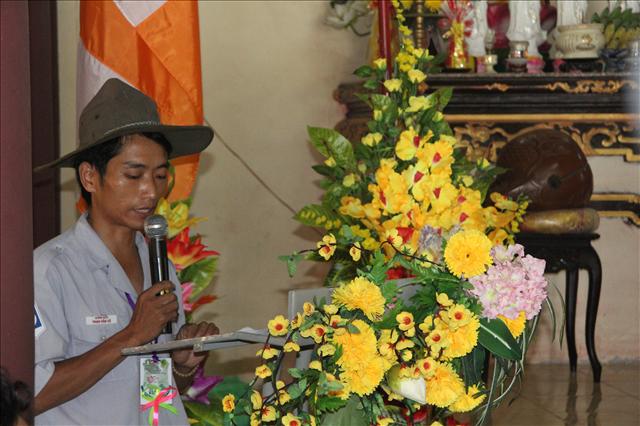 Huynh trưởng Cấp Tín: Quảng Thông - Lê Văn Hoàng phát biểu cảm tạ "Trãi qua hơn một tiếng đồng hồ, dưới bóng mát của ngôi già lam thân yêu. Được sự hộ niệm của mười phương chư Phật, sự chứng minh của chư Tôn thiền đức Tăng Ni, chúng con đã được tắm mình trong tình thương bao la rộng lớn và thấm đẩm chất liệu ngọt ngào, mát dịu hương từ bi.