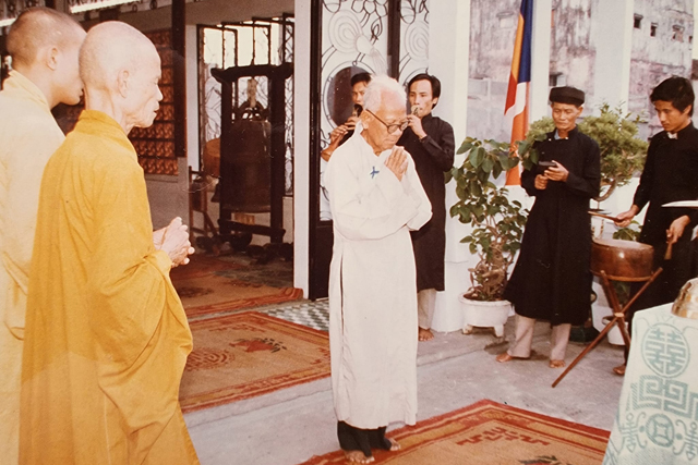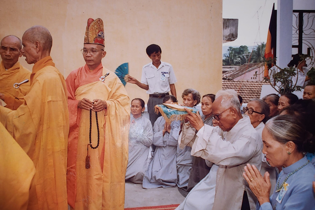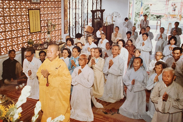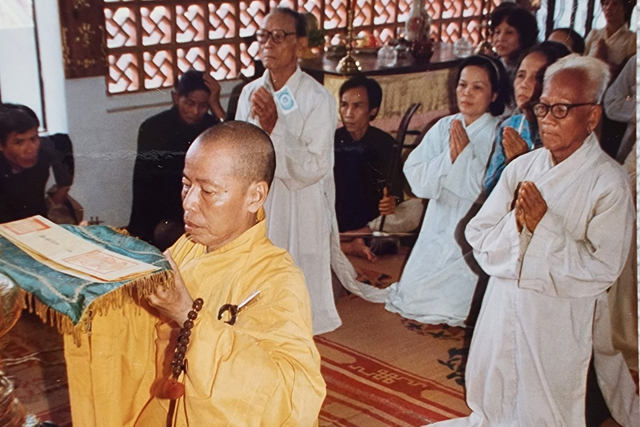 Cư sỹ Thị Quang - Lê Văn Miên chánh bái trong lễ lạc thành chùa Long Thơ năm 1990.
