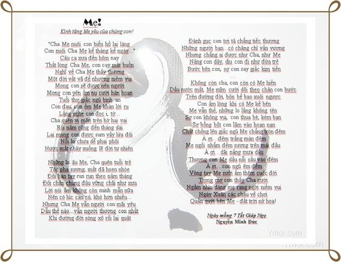 Những lo âu Mẹ, Cha quên tuổi trẻ, Tóc pha sương, mắt đã hoen nhòe, Đôi bàn tay run run theo năm tháng, Đôi chân chùng đâu vững chãi như xưa..........