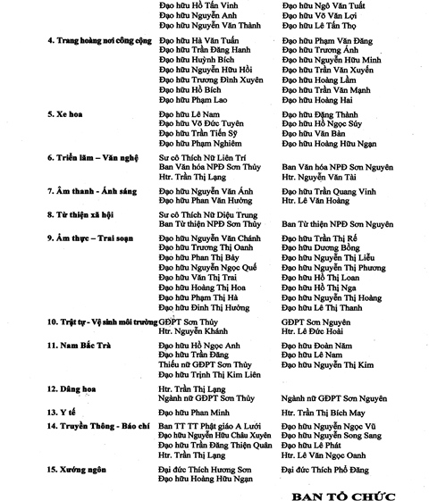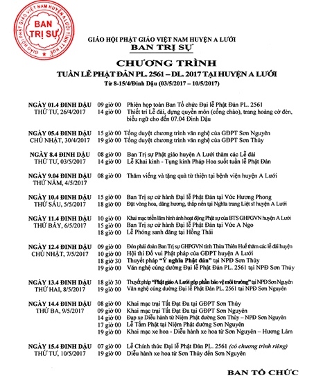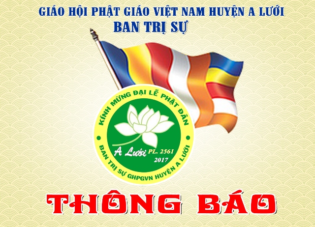Ban Trị sự GHPGVN huyện A Lưới kính thông báo và kính thỉnh chư Tôn giáo phẩm, trân trọng kính mời chư Tôn đức Tăng Ni và Phật tử trong Ban Trị sự huyện, các Ban ngành trực thuộc, các Ban Hộ tự Niệm Phật đường, Ban điều hành các Vức cùng quý Đạo hữu thiện tín, Ban Điều hành GĐPT huyện A Lưới, Ban Huynh trưởng và Đoàn sinh GĐPT hoan hỷ quang lâm tham dự lễ chính thức vào lúc 7 giờ 00 ngày 15.04 Đinh Dậu tại Lễ đài Niệm Phật đường Sơn Thủy và tham dự các chương trình trong Tuần lễ Phật đản Phật lịch 2561 tại huyện A Lưới để góp phần cầu nguyện.