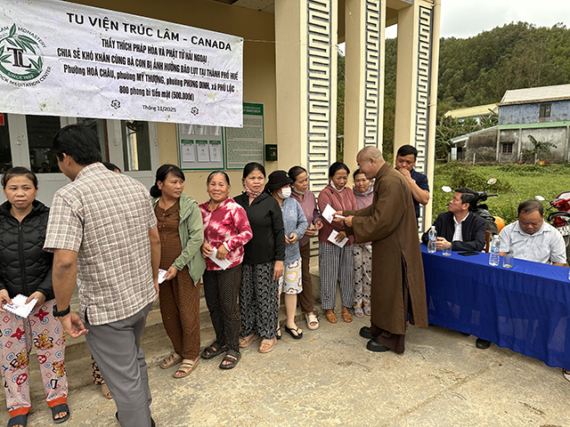 Với tấm lòng nhân ái và tinh thần “lá lành đùm lá rách”, Thượng Toạ Thích Pháp Hoà, Trú trì Tu viện Trúc Lâm - Canada đã uỷ cử Đại đức Thích Tâm Phương đại diện để trao tặng 400 phần quà đến bà con vùng lũ.