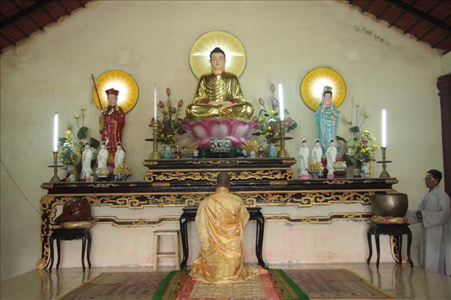 Dù chúng tôi lên rất sớm nhưng quý Bác trong Ban Hộ tự đã có mặt tại đây từ lúc nào. Quý Thầy cô mỗi người lo mỗi công việc, chúng tôi dạo quanh khuôn viên chùa Sơn Thủy, tham quan từ Chánh điện, đến Giảng đường, từ Văn phòng Ban Trị sự đến thư viện cũng như đoàn quán GĐPT Sơn Thủy, khung cảnh rất trang nghiêm thanh tịnh của chốn Thiền môn. Đúng 8 giờ, chương trình tu học bắt đầu, quý Bác đã vào thời khóa Sám hối hơn 30 phút trong sự nề nếp mà chúng tôi vô cùng cảm phục.