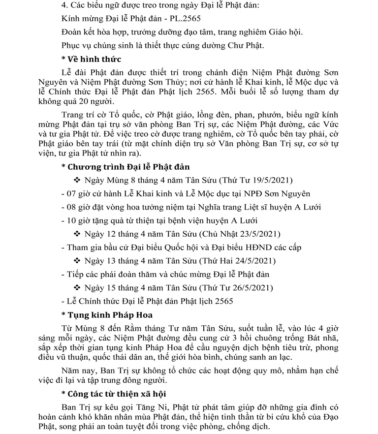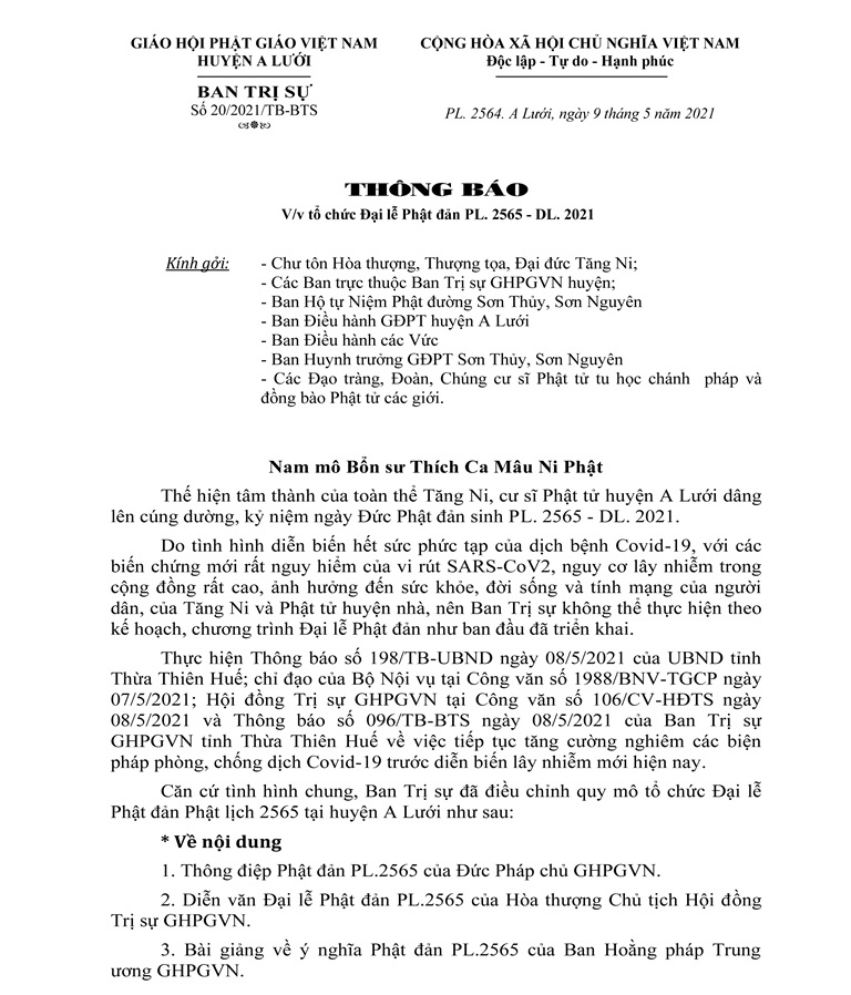 Đại đức Thích Tâm Phương, Ủy viên Ban Trị sự GHPGVN tỉnh Thừa Thiên Huế, Trưởng Ban Trị sự GHPGVN huyện A Lưới vừa ký Thông báo số 20/2021/TB-BTS vào ngày 9-5 gởi đến quý Tôn đức, các Ban Hộ tự, Ban Điều hành các Vức, Ban Điều hành GĐPT huyện, các Đạo tràng đoàn chúng cư sĩ trên địa bàn hướng dẫn tổ chức Đại lễ Phật đản PL. 2565 - DL. 2021 tại huyện A Lưới.