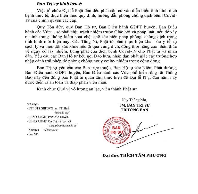 Nội dụng Thông báo nếu rõ: Do tình hình diễn biến hết sức phức tạp của dịch bệnh Covid-19, với các biến chứng mới rất nguy hiểm của vi rút SARS-CoV2, nguy cơ lây nhiễm trong cộng đồng rất cao, ảnh hưởng đến sức khỏe, đời sống và tính mạng của người dân, của Tăng Ni và Phật tử huyện nhà, nên Ban Trị sự không thể thực hiện theo kế hoạch, chương trình Đại lễ Phật đản như ban đầu đã triển khai.
