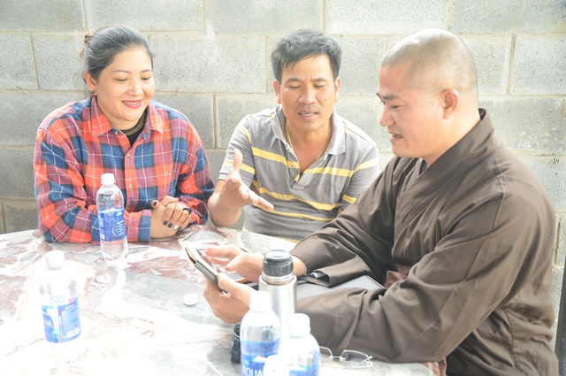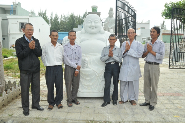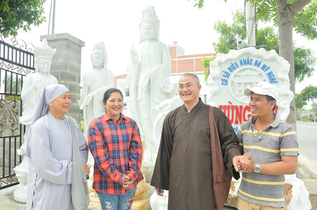 Chư Tôn đức và quý Đạo hữu trao đổi với Đạo hữu Quảng Tâm - Trần Văn Hùng; Quảng An - Nguyễn Thị Lệ, chủ cơ sở điêu khắc để đặt cọc và chọn mẫu pho tượng Đức Bồ tát Đại Thế Chí (chiều cao 5,2 m, đường kính 1,6 m) tại cơ sở đá mỹ nghệ Hùng Lan, khu làng nghề - lô 44, 45, đường Trương Gia Mô, thành phố Đà Nẵng.