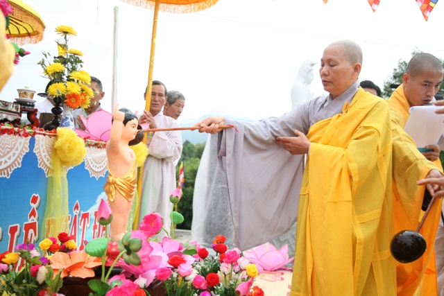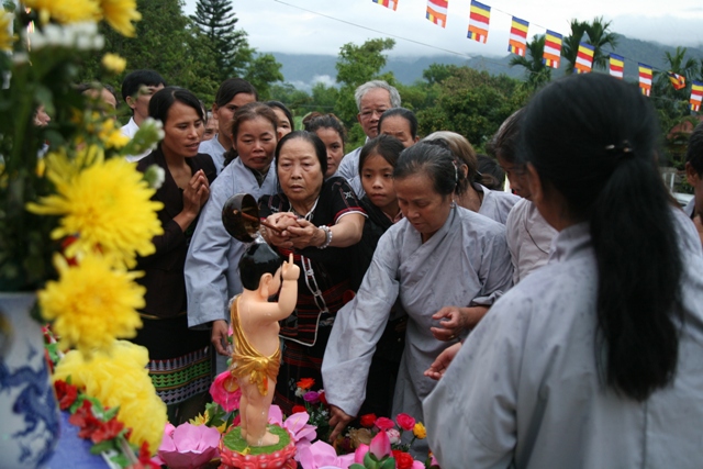 Đại Đức Thích Hương Sơn, Chánh Thư ký BTS GHPGVN huyện A Lưới đã tuyên đọc lời cảm niệm Lễ tắm Phật. Cách đây 2642 năm tại thành Ca Tỳ La Vệ xứ Ấn Độ, thái tử Tất Đạt Đa ra đời, Ngài con vua Tịnh Phạn và hoàng hậu Maya. Tương truyền rằng: Một hôm hoàng hậu Maya nằm mộng, thấy con voi trắng sáu ngà, từ trên trời đi xuống, vào bên hông phải của Bà, Hoàng hậu thức dậy, kể lại giấc chiêm bao cho các thầy đoán mộng, mọi người đều công nhận, đây là một điềm lành. Hoàng hậu sẽ sinh một hoàng nam, mà tài đức từ xưa đến nay chưa ai sánh kịp. Lời đoán mộng ấy đã trở thành hiện thực, hoàng hậu Maya mang thai. Đến lúc sắp sinh, theo tục lệ Ấn Độ, bà phải về nhà cha mẹ mình, trên đường đi, hoàng hậu vào nghỉ chân trong vườn Lâm Tỳ Ni. Một sớm mai trong vườn Lâm Tỳ Ni, chim thi nhau chuốt giọng trên cành, hoa thi nhau trải màu trên lá, và hương thơm từ bốn phương dồn lại, xông lên ngào ngạt khắp vườn, hoàng hậu Maya thấy lạ, ngự ra xem, đi đến góc cây vô ưu, thì liền Đản sanh Thái Tử.