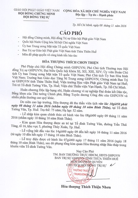 TM. BAN THƯỜNG TRỰC HĐCM, HĐTS GHPGVN BAN TRỊ SỰ GHPGVN TỈNH THỪA THIÊN HUẾ MÔN ĐỒ PHÁP QUYẾN CHỦ TỊCH HỘI ĐỒNG TRỊ SỰ (đã ký) Hòa thượng Thích Thiện Nhơn |