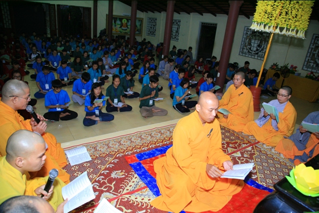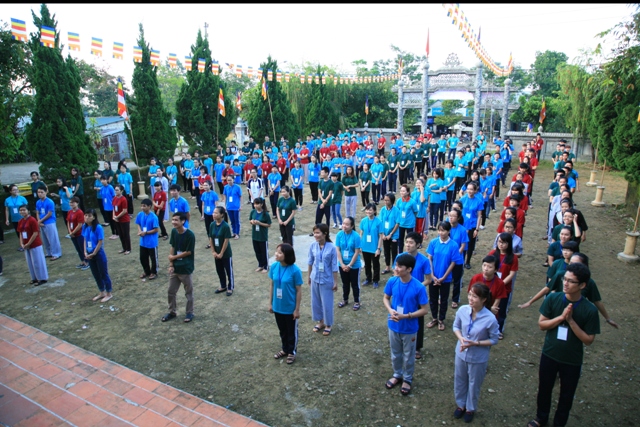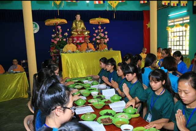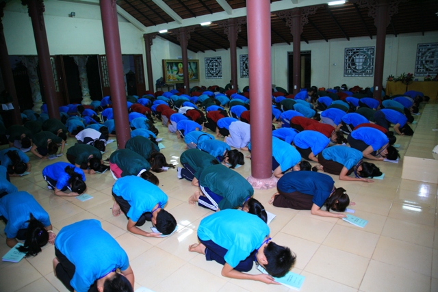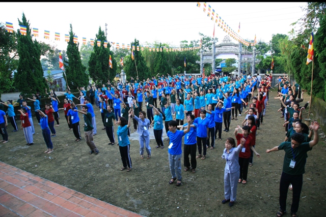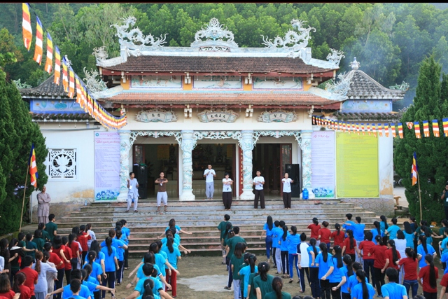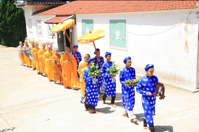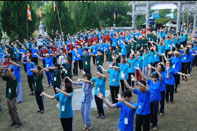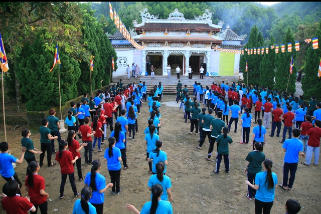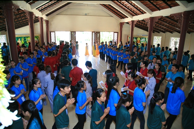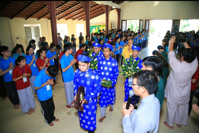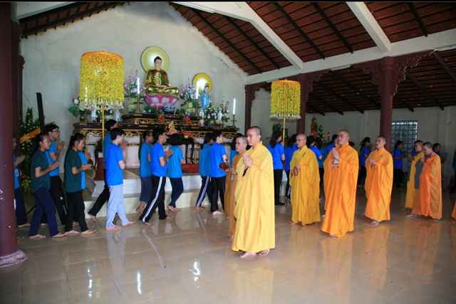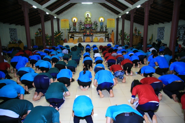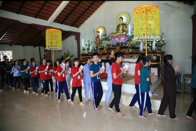 Sau khi hoàn thành bài thi viết cảm niệm và nghỉ giải lao, các khóa sinh tiếp tục được thực hành nghi thức quá đường và niệm Phật kinh hành dưới sự hướng dẫn của chư Tôn thiền đức BTS GHPGVN huyện A Lưới.