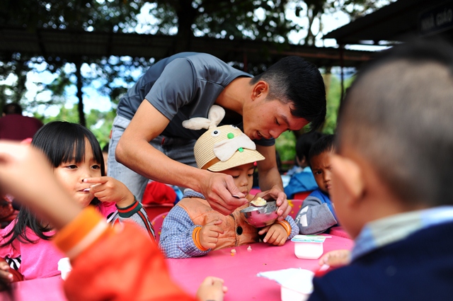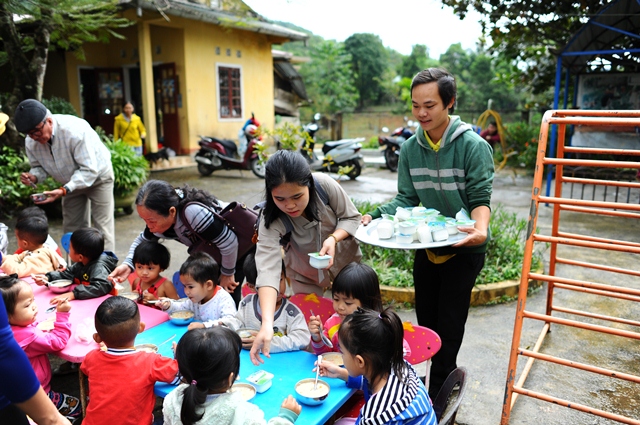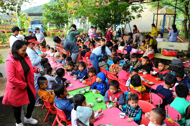 Một suất cháo dinh dưỡng và sửa chua cho 210 cháu với 7 lớp tại trường mầm non Sơn Ca