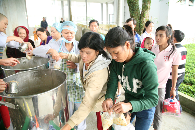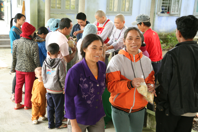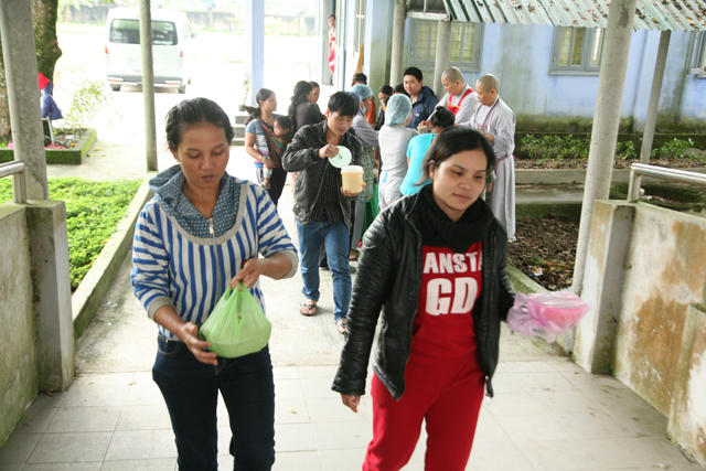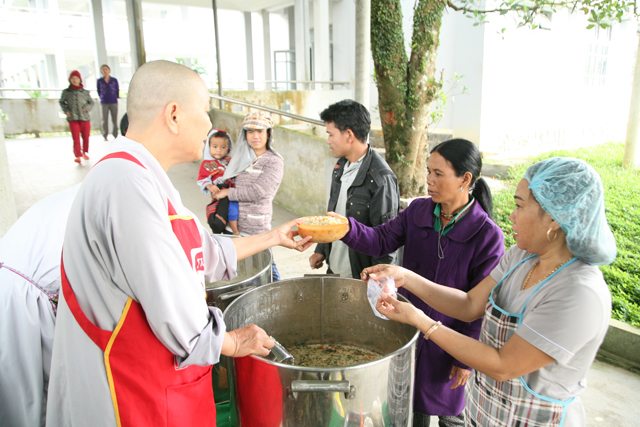 Buổi sáng cùng ngày chư Tôn đức trong Ban Trị sự GHPGVN huyện A Lưới đã về tại bệnh viện huyện A Lưới để mang nồi cháo An Lạc đến với các bệnh nhân đang điều trị tại đây.