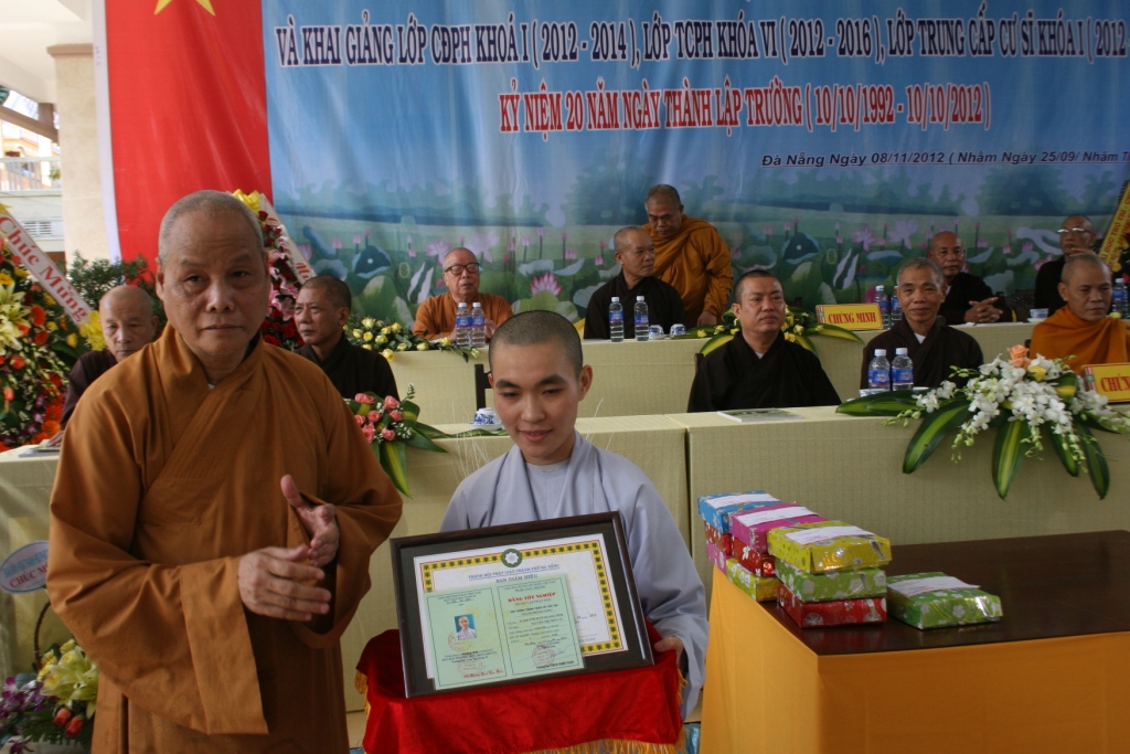 Đạo hữu Tâm Lượng - Nguyễn Đăng Hùng đại diện cho lớp Trung cấp cư sĩ khóa I, thành kính đảnh lễ niệm ân Chư Tôn thiền đức, Ban Giám hiệu nhà trường đã tạo điều kiện cho hàng cư sĩ Phật tử được trau dồi trí tuệ và đạo đức trong một môi trường mà từ xưa nay chỉ dành cho Tăng Ni, chúng con hứa cố gắng tinh tấn tu học để tự chuyển hóa tâm linh, đem an vui cho bản thân và xã hội.