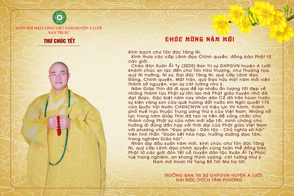 Nhân dịp đầu xuân năm mới, Đại đức Thích Tâm Phương, Trưởng Ban Trị sự GHPGVN huyện A Lưới kính lời chúc chư Tôn đức Tăng Ni, quý cấp Lãnh đạo chính quyền cùng toàn thể đồng bào Phật tử các giới đón Tết cổ truyền dân tộc Xuân Ất Tỵ: Phúc tuệ trang nghiêm, an khang thịnh vượng, cát tường như ý.
