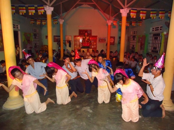 Ở đây các em được các anh chị trưởng hướng dẫn vui chơi trong không khí tưng bừng của ngày hội. Những trò chơi dân gian được các anh chị chuẩn bị rất chu đáo và tổ chức rất linh hoạt, Hóa trang chị Hằng, chú Cuội đi phát quà. Các em say mê hòa mình vào các cuộc vui một cách nhiệt tình trên tinh thần “Lục hòa”.