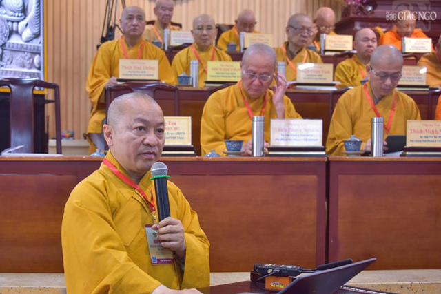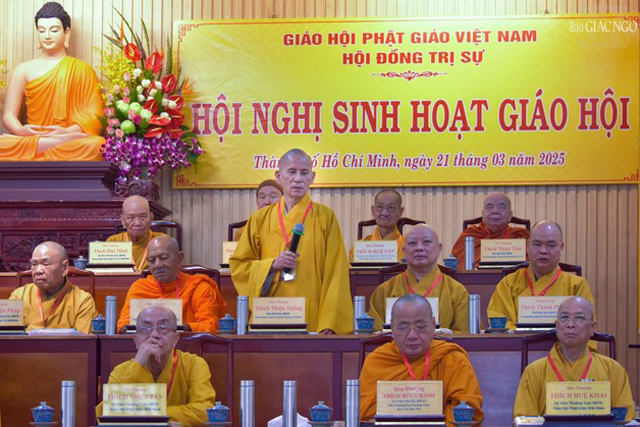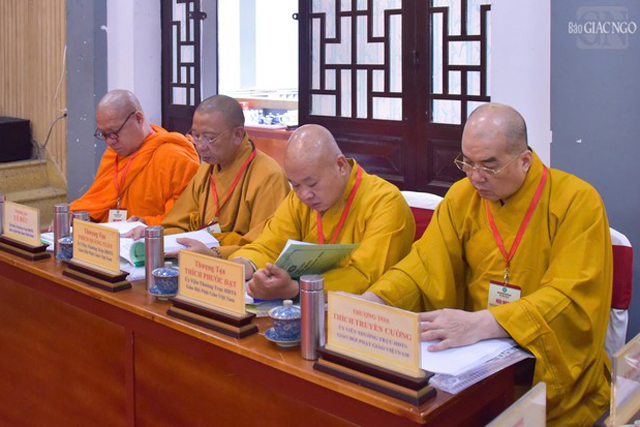 Thay mặt Hội đồng Trị sự, Hòa thượng Thích Huệ Thông, Phó Chủ tịch Hội đồng Trị sự, Trưởng ban Ban Pháp chế T.Ư triển khai việc thành lập Ban Quản trị tự viện; Thượng tọa Thích Minh Nhẫn, Ủy viên Thư ký Hội đồng Trị sự thông tin về công tác tuyên truyền cho Đại lễ Vesak Liên Hiệp Quốc Liên Hiệp Quốc 2025.