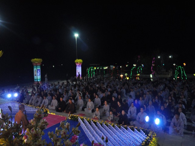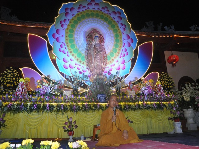 Đúng 7h tối, hai hàng Phật tử chắp tay cung kính cung nghinh đại đức trụ trì Thích Đạo Duyệt quang lâm pháp tòa, trước khi cử hành lễ ngũ bách danh cúng dường đức Bồ Tát Quan Âm, đại đức trụ trì đã gửi tới quý vị Phật tử những lời chia sẻ về hạnh nguyện của Bồ Tát, qua đó thầy cũng nhắc nhở Phật tử rằng mỗi khi gặp những khó khăn, hoạn nạn ta thường kêu cầu đến Ngài, nhưng khi có những người đau khổ, hoạn nạn cần sự giúp đỡ của ta thì ta lại làm ngơ thậm chí tỏ ra bực bội thì thật vô lý và ích kỷ, do đó sự cầu nguyện của chúng ta cũng khó thành tựu. Vậy nên trước khi cầu Bồ tát cứu mình, ta cần giúp đỡ mọi người trong khả năng có được.