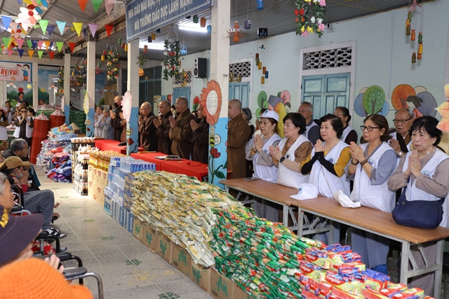 Tiếp theo đó, Thượng tọa Thích Minh Nhựt, Trưởng hội từ thiện "Bàn tay nhân ái" chia sẻ thêm đến quý Phật tử thành viên của Hội, dẫu biết rằng ngân quỹ của hội vẫn còn rất hạn hẹp, nhưng chúng tôi vẫn nỗ lực cố gắng thực hiện chương trình đầy ý nghĩa này. Chúng tôi đã đến từng nhà của những đối tượng mà hội đang bảo trợ nên cảm thông được sự thiếu thốn của họ. Họ là những mãnh đời bất hạnh, sống dưới những mái chòi tranh dột nát, thiếu thốn mọi bề. Thế nên những phần quà nhỏ bé của chúng ta sẽ là nhiên liệu tình thương xoa dịu phần nào khổ đau của mọi người. Tại đây, Hội từ thiện "Bàn tay nhân ái" đã trao tặng gần 300 suất quà, mỗi suất quà trị giá hơn 1.500.000đ, gồm hiện kim, các nhu yếu phẩm, học bỗng cho các em học sinh nghèo hiếu học và 51 chiếc xe lăn cho người khuyết tật, tổng trị giá hơn 600 triệu đồng.