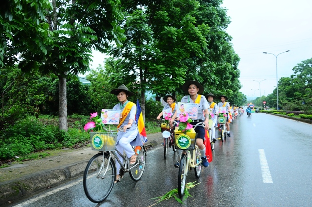 Hòa chung không khí thiêng liêng đó, GĐPT huyện A Lưới đã thực hiện hơn 50 chiếc xe thiết trí cờ hoa, đạp xe hưởng ứng cổ động phong trào kính mừng Phật đản.