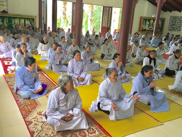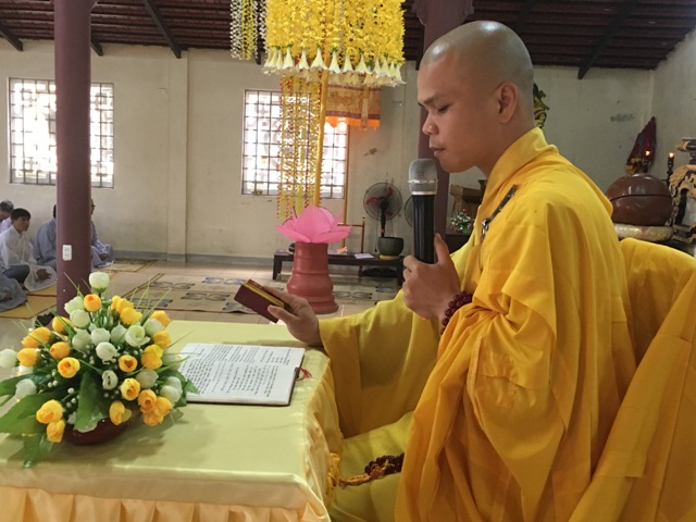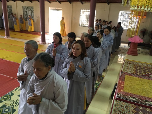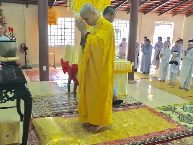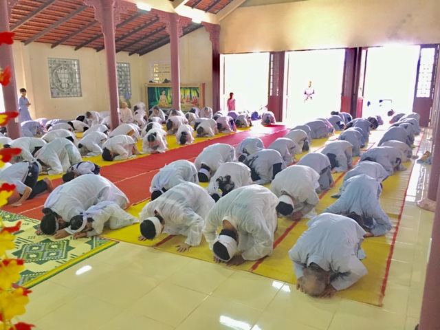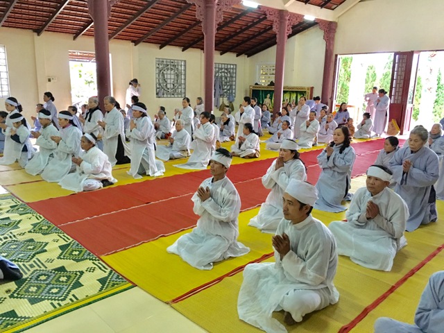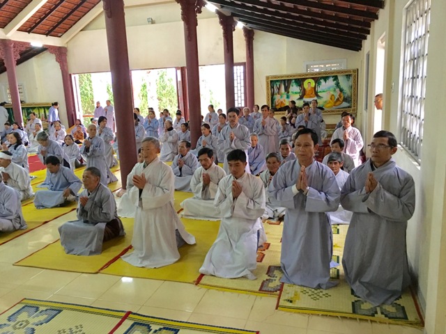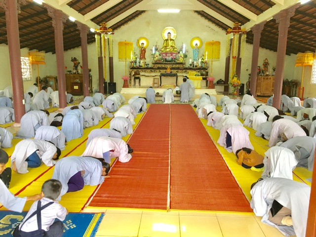 Đúng 7 giờ 30 phút, quý Phật tử vân tập cử hành nghi thức sám hối, toàn thể đạo tràng trang nghiêm phủ phục 5 vóc sát đất, sám hối tam nghiệp của mình cho được thanh tịnh để lắng nghe giới pháp.