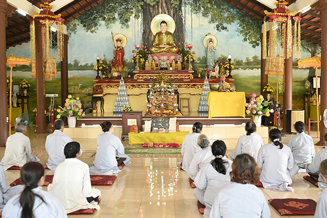 Sau phần niêm hương bạch Phật, Đại đức Thích Thiền Huy, Chánh Thư ký Ban trị sự GHPGVN huyện A Lưới đã hướng dẫn quý Phật tử sám hối lục căn cho thanh tịnh và truyền trao giới Pháp Bát Quan trai. Trong không khí trang nghiêm thanh tịnh nơi Đại hùng bảo điện, Đại đức Thích Thiền Huy thực hiện nghi thức truyền trao giới Pháp cho các giới tử và sách tấn đại chúng thực hành tu tập Bát Quan trai tinh tấn, dõng mãnh.