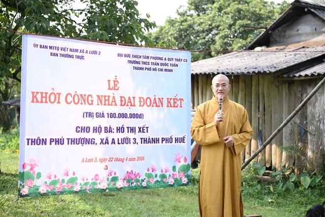 Đại diện chính quyền địa phương, bà Lê Thị Mai Loan đã gửi lời cảm ơn sự giúp đỡ của Đại đức Thích Tâm Phương cùng quý phái đoàn tổ chức buổi lễ khởi công xây nhà Đại Đoàn kết cho hộ gia đình bà Hồ Thị Xết có hoàn cảnh khó khăn về nhà ở. Đây là một hoạt động mang đậm ý nghĩa nhân văn, thể hiện tinh thần đoàn kết, sẻ chia, tương thân tương ái trong cộng đồng. Thay mặt lãnh đạo địa phương, tôi xin gửi lời tri ân sâu sắc đến Đại đức Thích Tâm Phương cùng quý Phái đoàn đã đồng hành cùng chính quyền, thể hiện nghĩa cử cao đẹp bằng những hành động thiết thực, góp phần chăm lo cho đời sống người dân, xây dựng khối đại đoàn kết toàn dân tộc ngày càng vững mạnh.