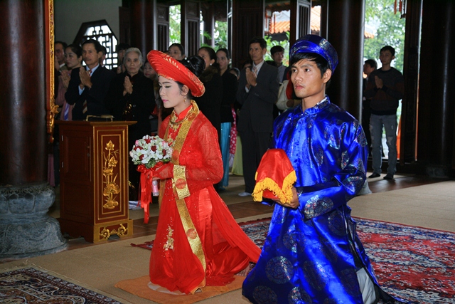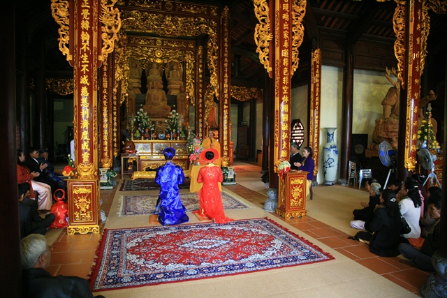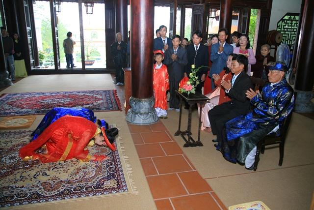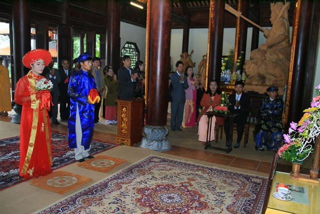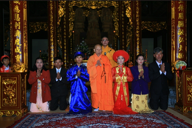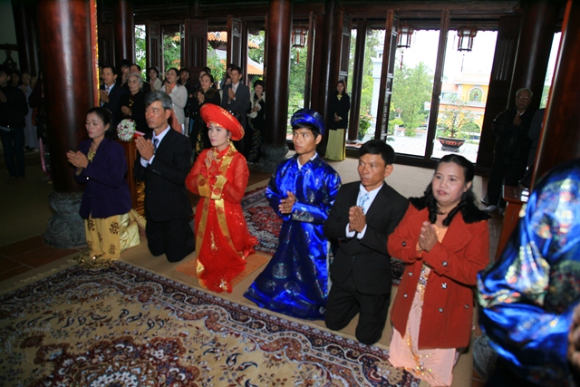 Đôi tân lang tân nương đảnh lễ niệm ân chư Tôn đức, cha mẹ hai bên trên tinh thần tri ân và báo ân của người con Phật.