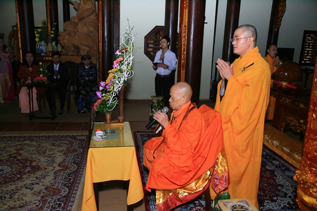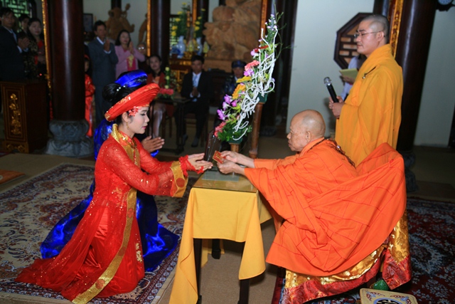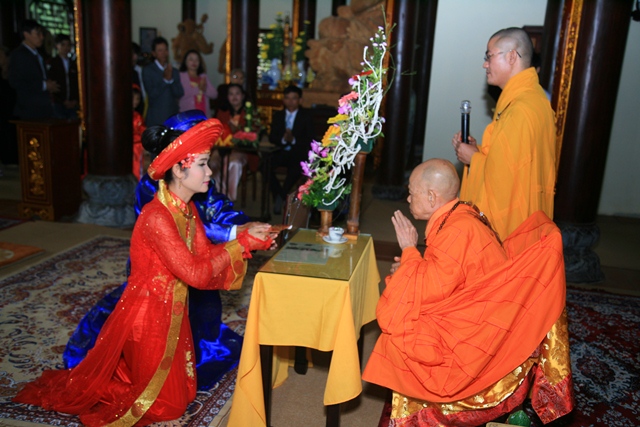 Sau khi đại diện hai bên gia đình phát biểu, đôi bạn trẻ phát nguyện trước Tam bảo dưới sự chứng minh của hiện tiền chư Tôn đức: