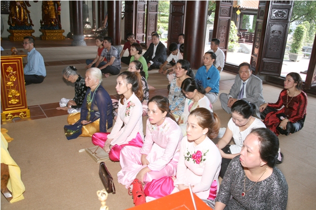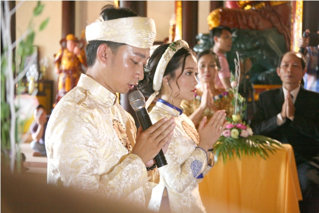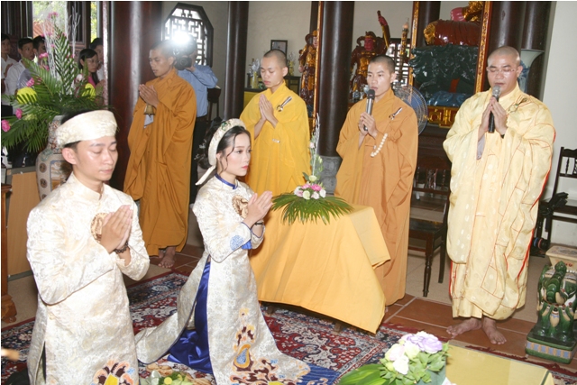 Thượng tọa Thích Lương Nguyên đã cử hành Khóa lễ cầu an, cầu nguyện và chúc phúc cho đôi bạn trẻ. Tại buổi lễ Hòa thượng Thích Chơn Tế chú nguyện và trao cho đôi Tân lan Tân nương đôi nhẫn cưới, Hòa thượng cũng đã nêu rõ ý nghĩa của đôi nhẫn cưới cũng như khuyến tấn đôi bạn trẻ sống sao chế ngự tam độc đó là chế ngự được Tham - Sân - Si để đạt được một cuộc sống chân thiện mỹ, đó là nút tháo gỡ nỗi khổ niềm đau của đôi bạn trẻ khi tiến vào con đường đường cuộc sống hôn nhân.