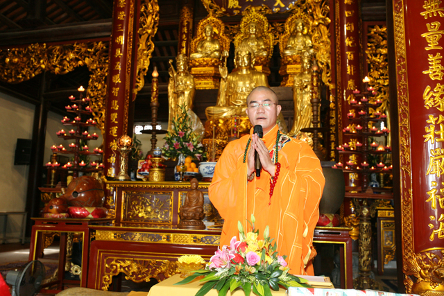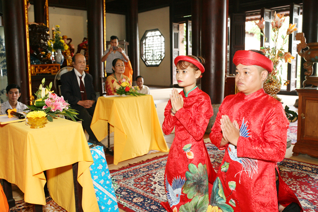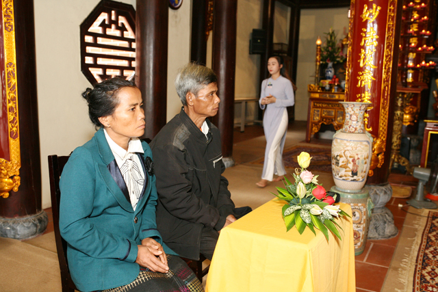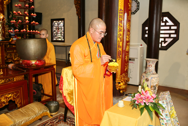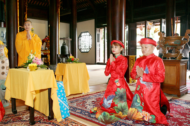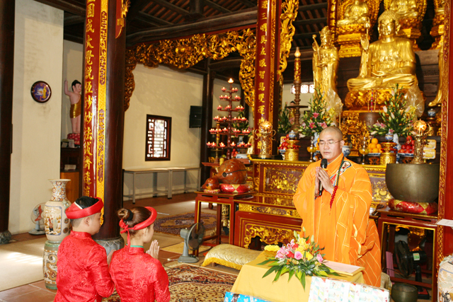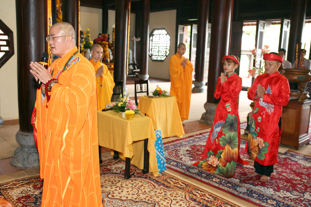 Đại đức Thích Tâm Phương đã cử hành Khóa lễ cầu an, cầu nguyện và chúc phúc cho đôi bạn trẻ. Tại buổi lễ Đại đức chứng minh đã chú nguyện và trao cho đôi Tân lan Tân nương đôi nhẫn cưới, Đại đức cũng đã nêu rõ ý nghĩa của đôi nhẫn cưới cũng như khuyến tấn đôi bạn trẻ sống sao chế ngự tam độc đó là chế ngự được Tham – Sân – Si để đạt được một cuộc sống chân thiện mỹ, đó là nút tháo gỡ nỗi khổ niềm đau của đôi bạn trẻ khi tiến vào con đường đường cuộc sống hôn nhân.