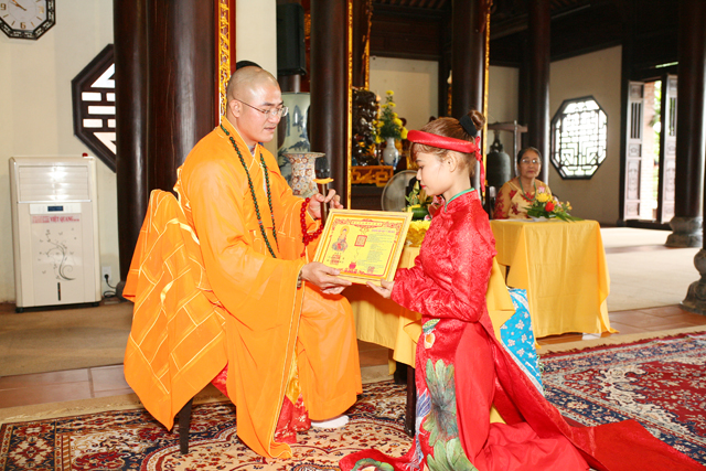 Trao chứng điệp Quy y đến phật tử Hồ Thị Phơi