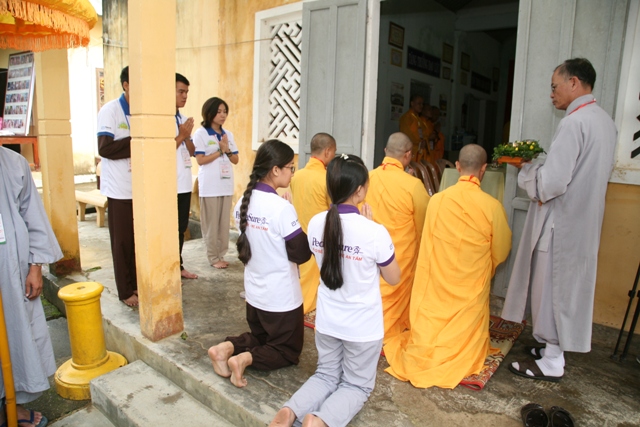 Khóa sinh Trần Thị Thanh Thủy đại diện các khóa sinh đồng tu đọc lời phát nguyện. "Con xin thay mặt cho gần 300 bạn trẻ về tham dự khóa tu tuổi trẻ “Suối nguồn yêu thương 2” do Ban Trị sự GHPGVN huyện A Lưới tổ chức tại Niệm Phật đường Sơn Thủy với thời gian 3 ngày 2 đêm xin phát nguyện;