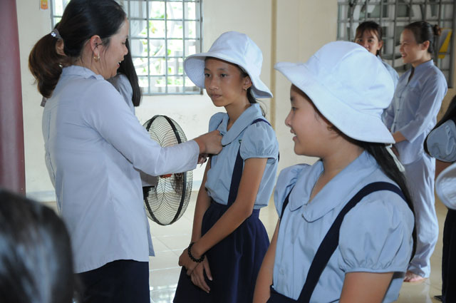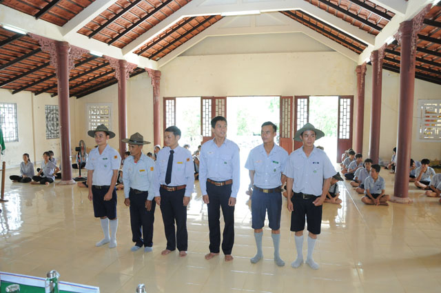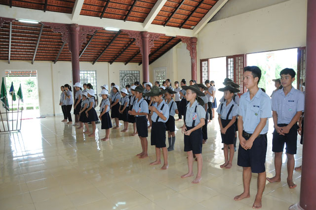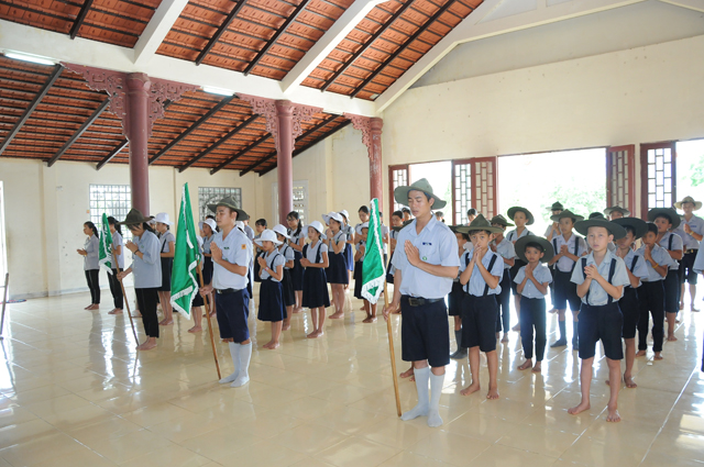 Đeo phù hiệu trại cho các em trại sinh