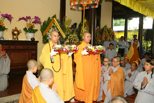 Nhị vị Đại đức dẫn lễ trong sự trang nghiêm thành kính tiến về Giác linh đài. Thượng tọa Thích Thanh Phước, trưởng pháp tử xúc động thành kính dâng lên cúng dường Tôn sư.
