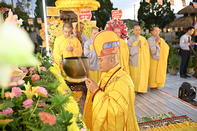 Trong không khí trang nghiêm, hương trầm quyện tỏa, chuông trống Bát-nhã trầm hùng, lễ chính thức đã diễn ra trong không khí trang nghiêm, linh thiêng và thành kính chư Tôn giáo phẩm Chứng minh niêm hương cúng dường, đoàn sinh Gia đình Phật tử dâng hoa cúng dường. Chư Tăng Ni, Phật tử đồng tụng bài sám Khánh đản, Tứ Hoằng thệ nguyện, thực hiện nghi thức Đại lễ Phật đản theo nghi lễ truyền thống của Phật giáo đất Cố Đô, nguyện cầu Tổ quốc vinh quang, Đạo pháp trường tồn, dịch bệnh tiêu trừ, chúng sanh an lạc.