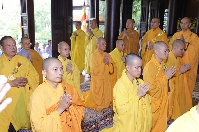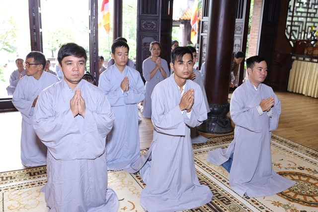 Đúng 09h30, chư vị pháp tử cung thỉnh Trưởng lão Hòa thượng chứng minh niêm hương tưởng niệm. Tiếp đó, Trưởng lão Hòa thượng Thích Quang Nhuận, đương vi sám chủ cùng chư tôn đức cử hành lễ cúng ngọ theo nghi thức thiền môn xứ Huế.