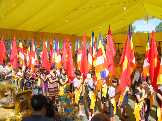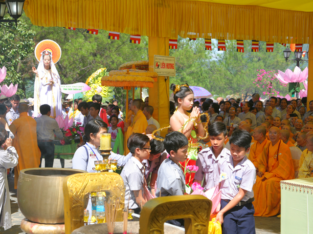 Đoàn dâng hương, hoa, quả phẩm hóa trang các dân tộc có sự tham gia của các Ban ngành trực thuộc Ban Trị sự, các Ban Trị sự GHPGVN huyện Thị xã, hàng chục Đạo tràng, đoàn chúng Phật tử đến từ trong và ngoài tỉnh, ….với đầy đủ các sắc màu và phẩm vật, đặc sản truyền thống các vùng miền cùng hướng lòng thành dâng cúng ngày khánh đản của mẹ hiền Quán Thế Âm.
