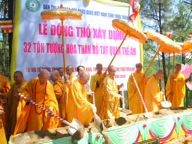Tiếp đến, toàn thể chư tôn thiền đức Tăng Ni cùng quý quan khách tham dự đã tiến hành lễ động thổ xây dựng 32 tôn tượng hóa thân Đức Quán Thế Âm Bồ Tát. 32 tôn tượng được điêu khắc bằng đá granit tự nhiên, cao trung bình là 6m, diện tích đất sử dụng của dự án là 5,870m2 được quy hoạch tập trung xung quanh tượng đài Quán Thế Âm; các vị trí tượng được đặt theo ý nghĩa của từng tượng hóa thân như: Tượng Bồ Tát Liên Ngọa Quan Âm với hình tượng Bồ Tát chắp tay ngồi thiền trong đóa sen được đặt tại hồ Tĩnh Tâm, tượng Bồ Tát Ngư Lam Quan Âm với hình tượng Bồ tát tay xách giỏ đựng cá được đặt tại đường xuống hồ Tĩnh Tâm...