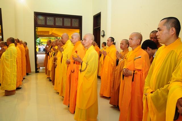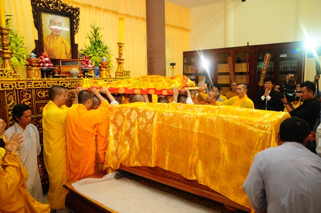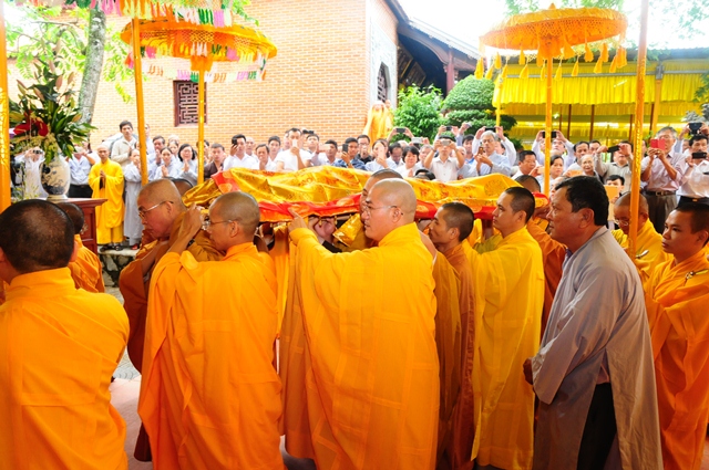 Chư Tôn đức trong môn đồ pháp quyến đã cung thỉnh nhục thân Ngài đi giữa hai hàng Tăng Ni và Phật tử hai bên làm hàng rào cung tiễn.