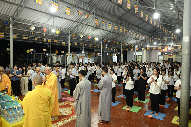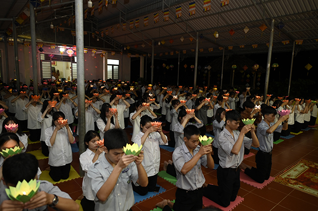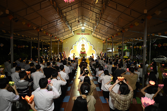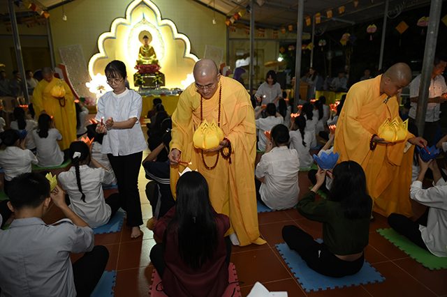 Một trong những phần thiêng liêng và ý nghĩa nhất của buổi lễ là nghi thức Truyền đăng. Từ ánh sáng ban đầu của ngọn đèn Tam Bảo do chư Tôn đức thắp lên, từng ngọn nến được chuyền tay nhau trong sự tĩnh lặng, chánh niệm – tượng trưng cho ánh sáng của trí tuệ, niềm tin và lòng từ bi được lan tỏa.