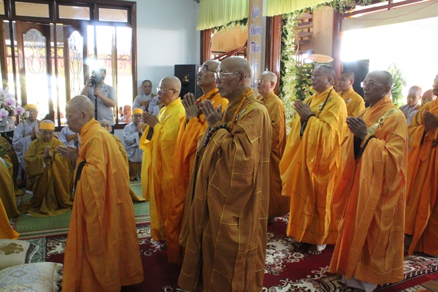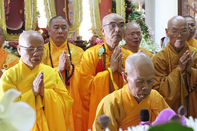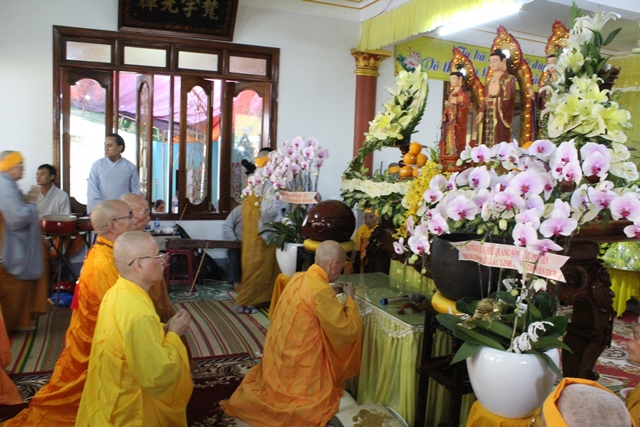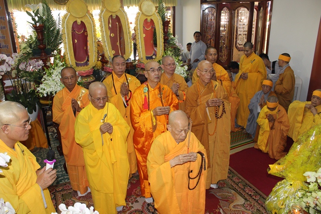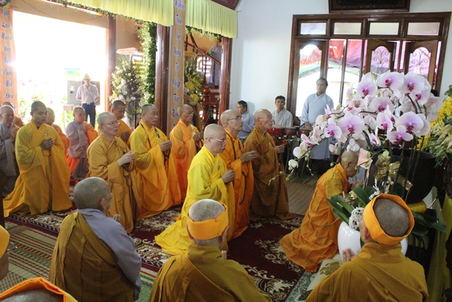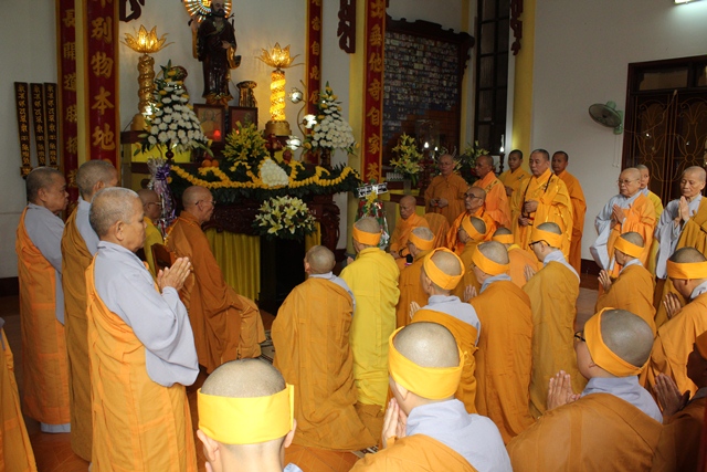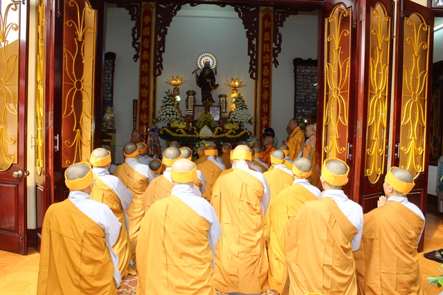 Môn nhơn đệ tử Cố Trưởng lão Ni Thích Nữ Tâm Hoa đảnh lễ cung thỉnh chư Tôn đức tại Tổ đường chùa Tâm Ấn.
