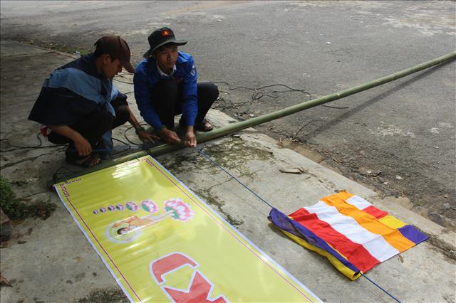 Không chần chừ, theo như kế hoạch được Quý Thầy Cô sắp xếp từ trước, đoàn được chia làm hai nhóm: một ở tại NPĐ Sơn Thủy và một ở tại NPĐ Sơn Nguyên. Sau khi chia nhóm và tiễn nhóm NPĐ Sơn Nguyên lên đường làm nhiệm vụ, tôi cùng nhóm còn lại bắt tay vào công việc. Công việc của chúng tôi đó là kiểm tra và thay thế Đạo kì, treo pano cổng chính, treo đèn tại các khu vực, và trang hoàng xung quanh bằng gần 250 hoa sen vải khung tre.