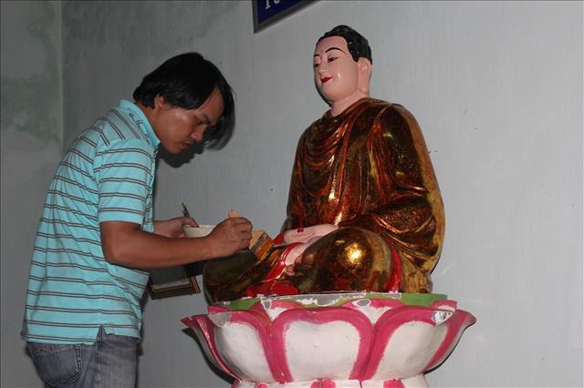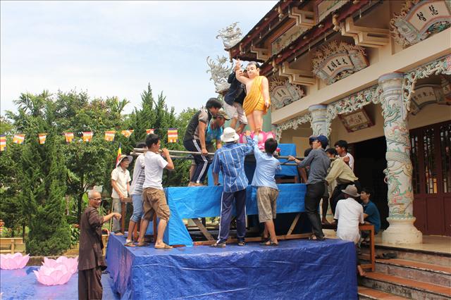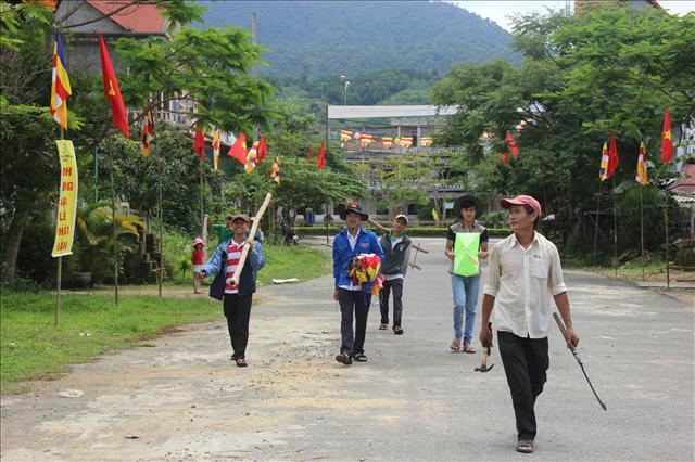 Không khí tại chùa lúc này rất vui tươi, các Bác trong Ban Hộ tự đang làm Lễ đài và xe hoa, các em Đoàn sinh GĐPT thì đang làm trại. Nhìn những “ngôi” trại nhà sàn được thực hiện hoàn toàn bằng tre, lồ ô và buộc bằng dây gấc, các thành viên trong đoàn ai cũng trầm trồ khen ngợi – một phong cách làm trại rất chuyên nghiệp, và cả đoàn còn bất ngờ hơn khi thấy những “kỹ sư xây dựng” là những đoàn sinh rất trẻ, và có cả thiếu nữ.