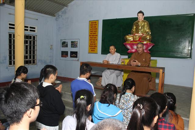Khoảng 15h, nhiệm vụ của chúng tôi gần như hoàn tất. Quý Thầy Cô mời chúng tôi vào tham dự buổi duyệt chương trình Văn nghệ Phật đản của huyện. Những tiết mục đậm chất “cây nhà lá vườn” thật là đậm đà làm sao, làm cho cả kí ức của tôi quay về.