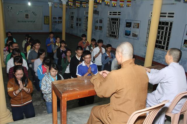 20h00, sau khi dùng bữa tối – cả đoàn chúng tôi cùng quỳ dưới Đức Phật, dưới sự chứng minh của chư Tôn đức trong Ban Trị sự GHPG huyện A Lưới, trưởng đoàn đã thay chúng tôi bày tỏ sự tri ân đến Ban Trị sự huyện nhà đã tạo điều kiện cho các thành viên có cơ hội cúng dường nhân mùa Phật đản và mở rộng hiểu biết.